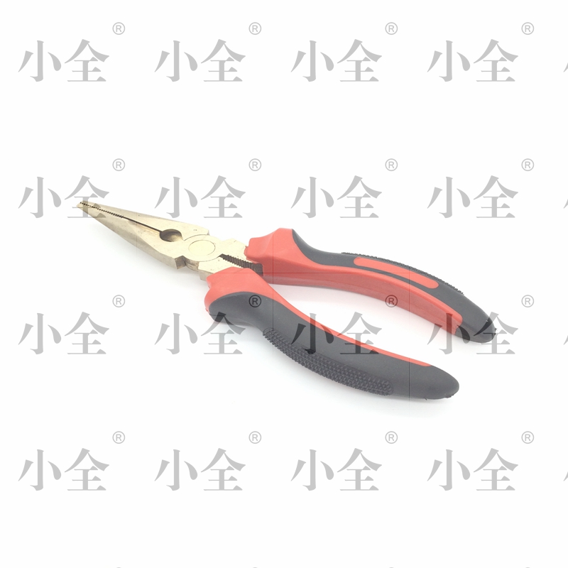 4防爆尖嘴钳在易燃、易爆等特殊的工作场所里使用时,不会因为夹断铁丝、拔出铁器、敲击其他的物体而产生机械火花引发安全事故的发生,所以说防爆尖嘴钳是一种绝对安全的钳工类工具产品。